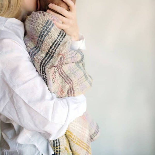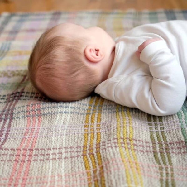 Pleddet er rillestrikket i en vårlig palett. Én hovedfarge brytes med fargerike striper. Etter pleddet er ferdig strikket, sys det inn loddrette striper for å danne rutemønsteret.