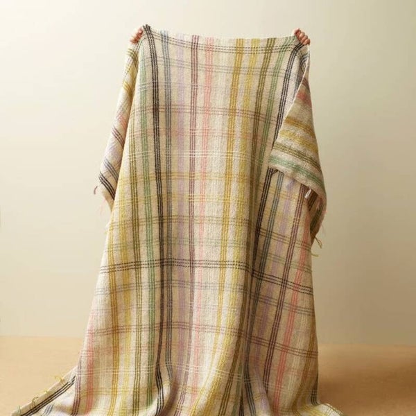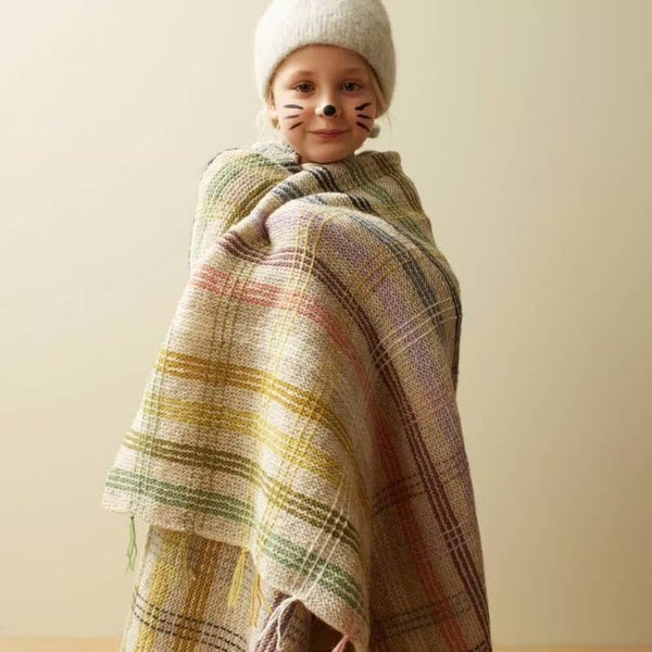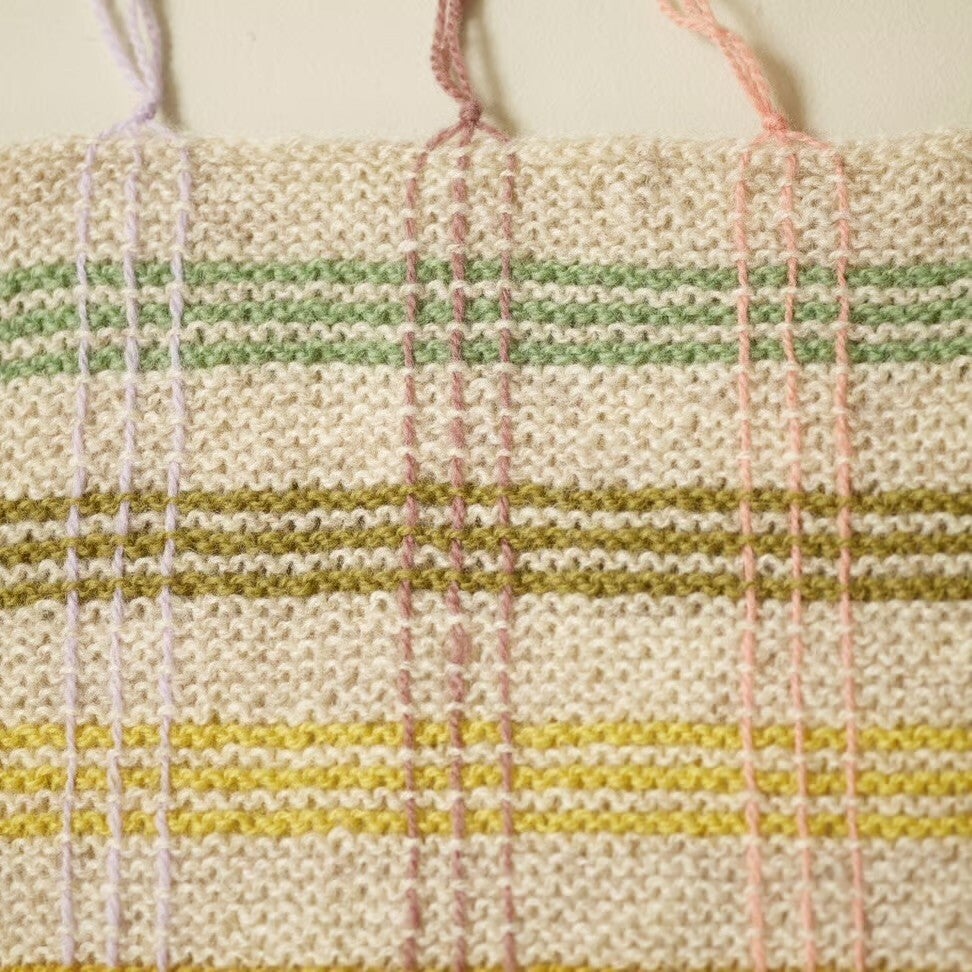 Pleddet er rillestrikket. Én hovedfarge brytes med fargerike striper. Etter pleddet er ferdig strikket, sys det inn loddrette i striper for å danne rutemønsteret.